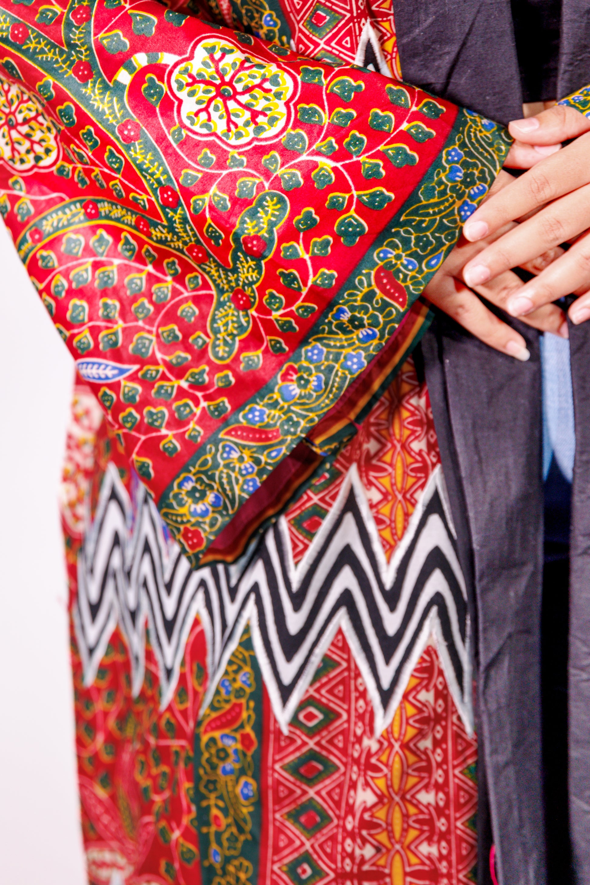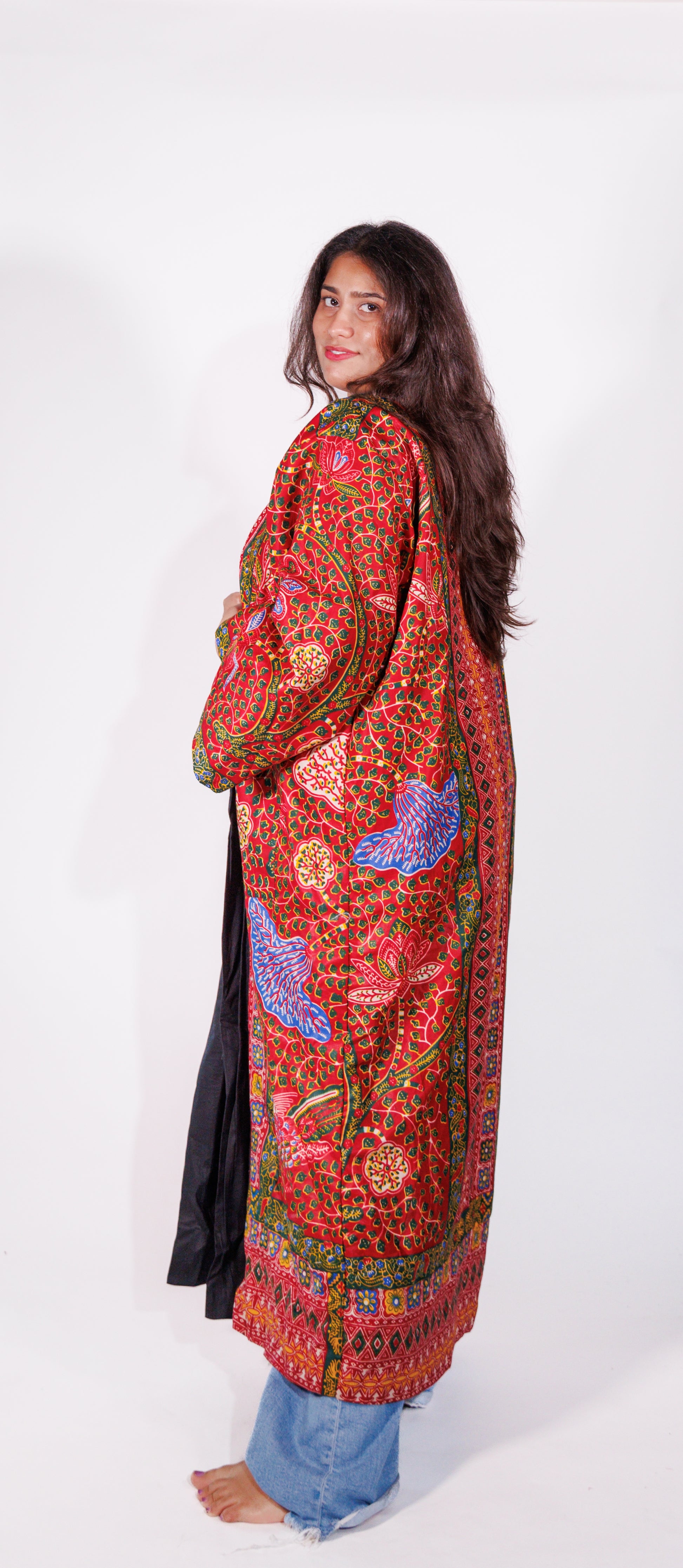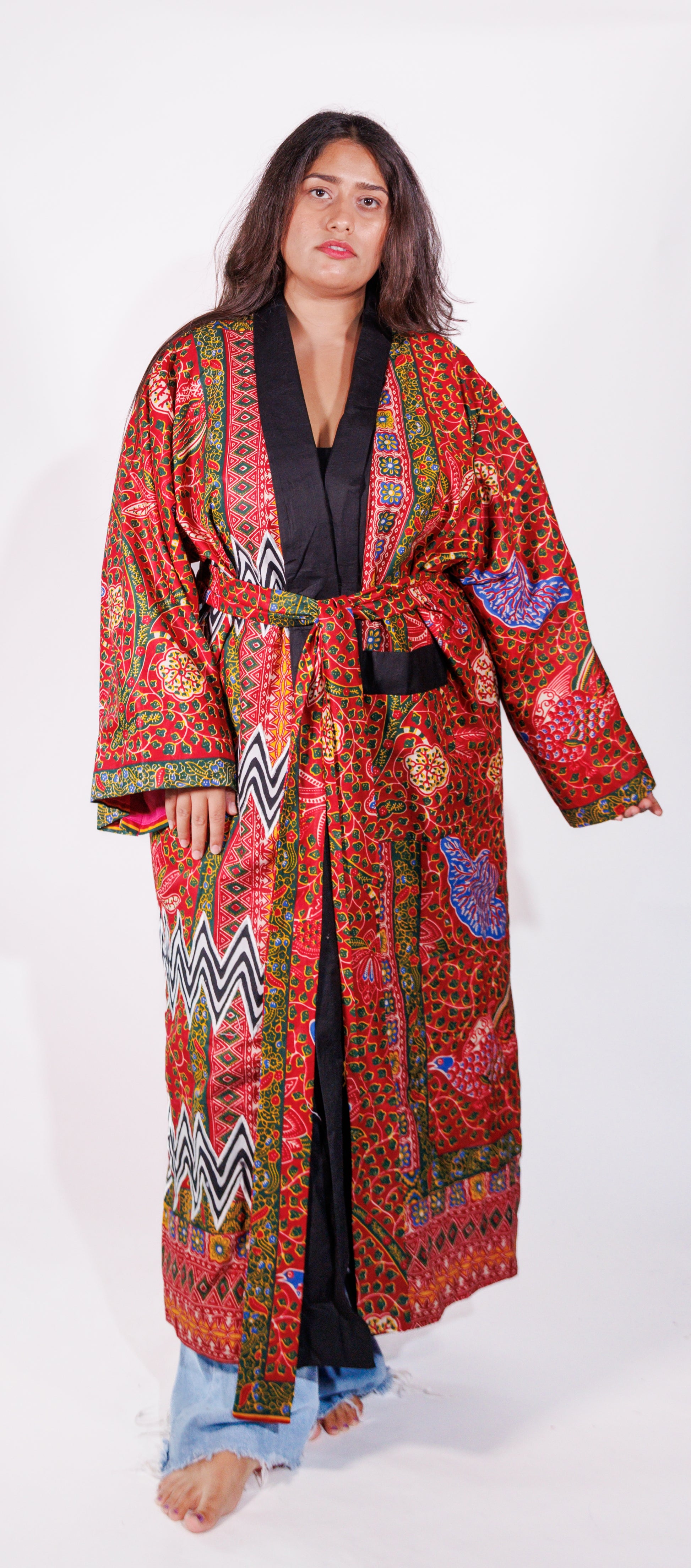 Part of a limited release capsule collection by Adorn Me Africa . This statement piece wraps you in art, culture, and comfort. This one-of-a-kind floor-length kimono features a bold mix of vibrant red, green, and black patterns inspired by traditional prints. Detailed with intricate motifs and a contrasting black lapel, it’s designed to make you feel effortlessly regal—whether you’re lounging at home or layering it over jeans for a chic street-style look.